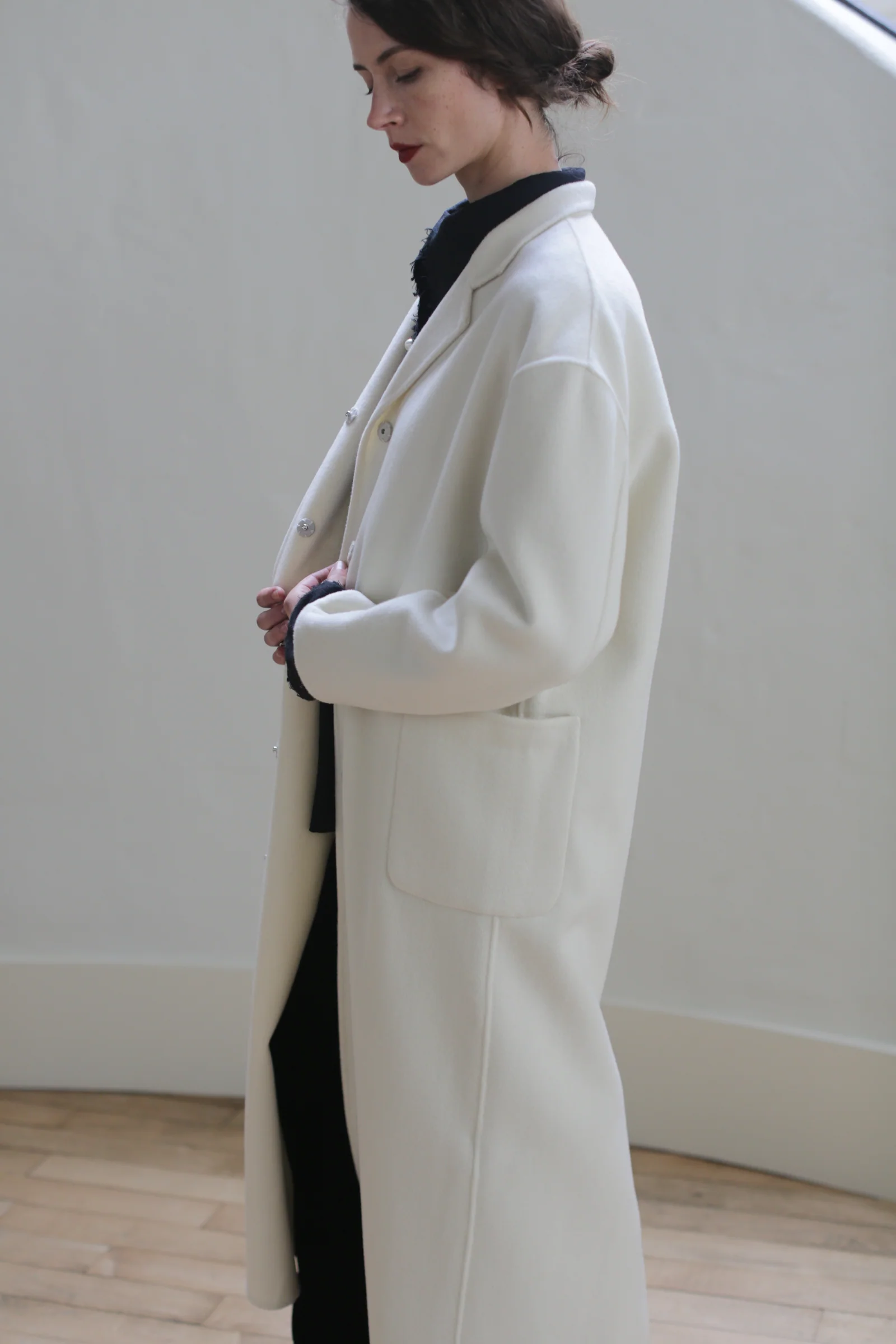 This sweeping, dramatic coat shows off the Double-faced Cashmere's fluidity to full effect. The sharp, graphic collar adds contrast to the fabric's soft lines. Supremely chic and luxurious - wear it to grab a coffee with a friend or over an evening dress. Swaddle yourself in the ultimate warm, sleek material.