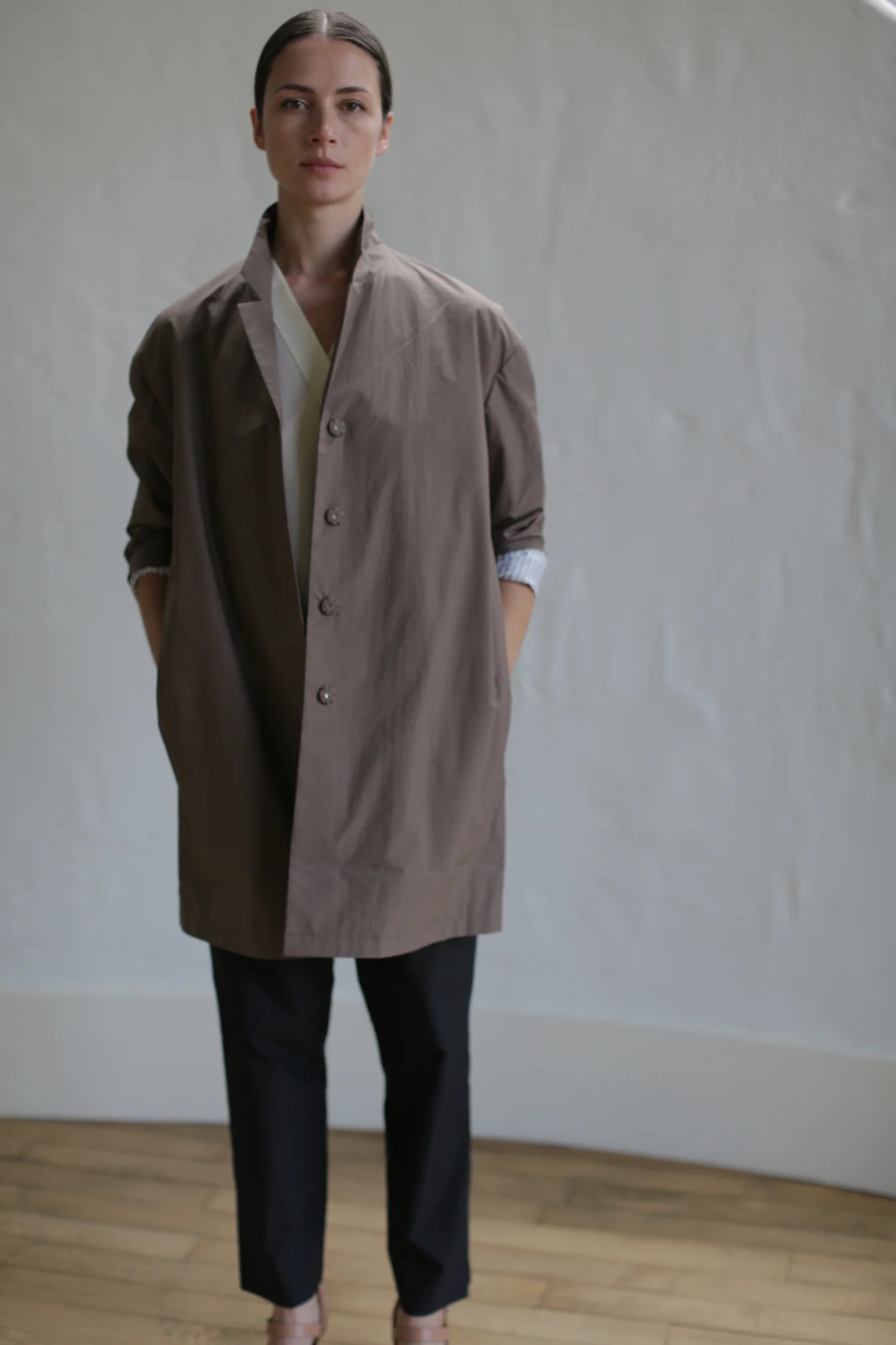 Our new Painter's Jacket in featherweight Typewriter Cotton strikes the perfect balance between utilitarian and glamorous, a balance decidedly tipped when accessorized with the leather Obi Belt. Inspired by the functionality of painters' smocks, this breezy jacket is perfect for a range of seasons and scenarios. White with navy pinstripe lining enhances the impression of crispness. Here in warm, versatile clay.