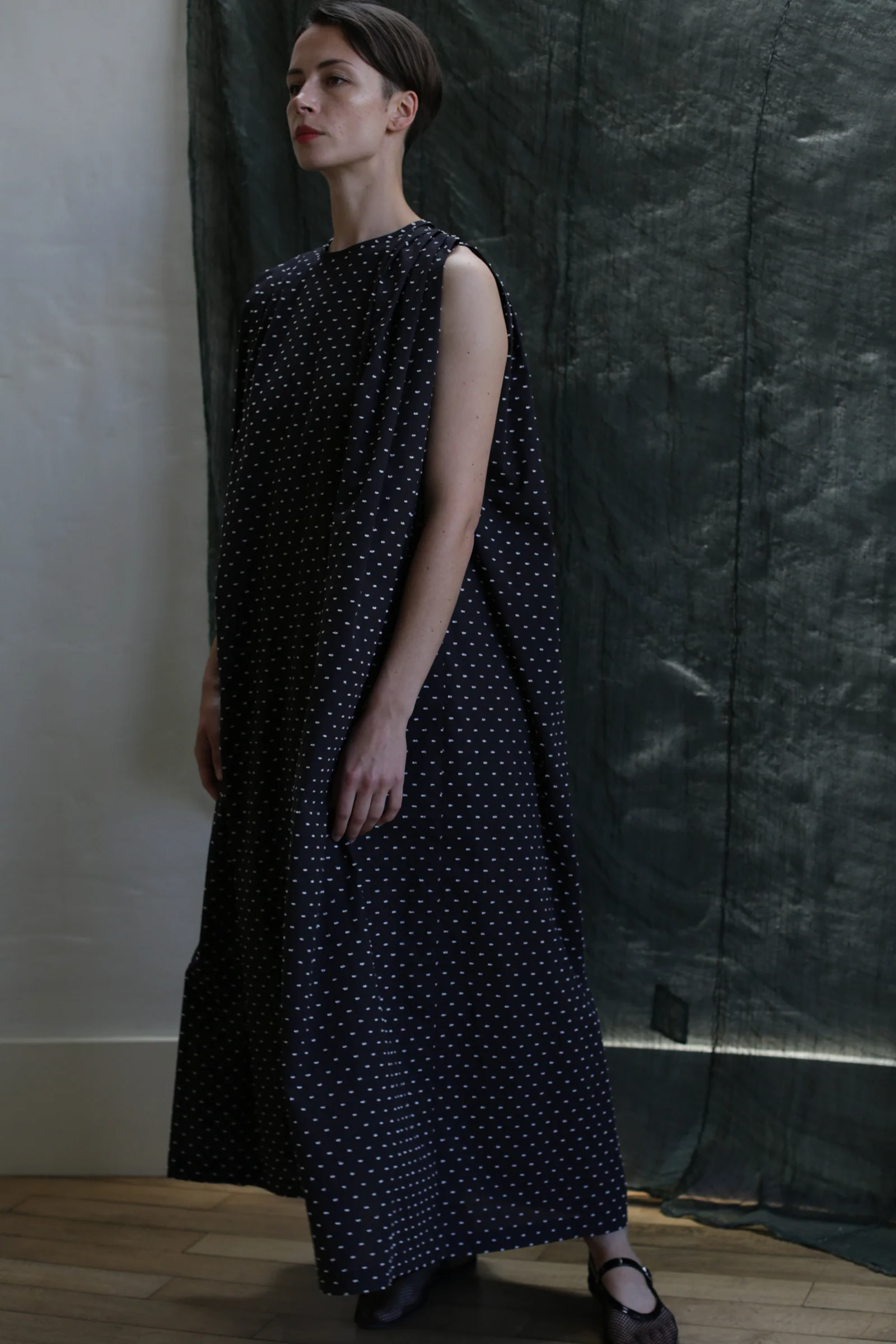 This supremely elegant and comfortable dress features a distinct shoulder-pleat design, creating a strikingly dynamic form to be worn in two ways: with the back-bow, the dress is at full flow and volume; or untie the bow and use it as a belt to accentuate the waist.