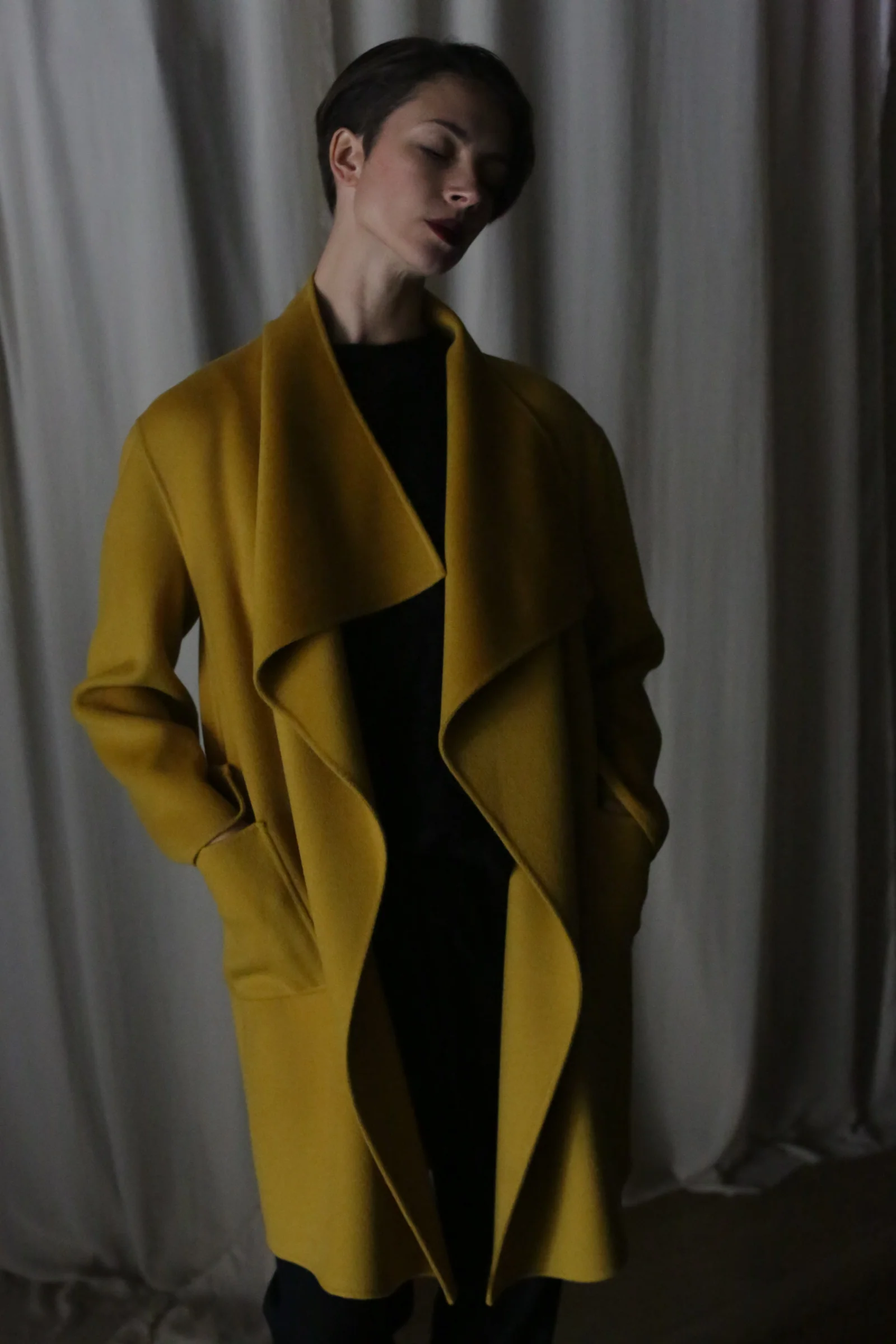 The Winston Long Double-Face returns in striking new colors: Saffron, Aubergine, and Wine, bringing fresh vibrancy to this enduring favorite. The draped collar and dropped shoulders give the coat a relaxed, fluid structure that invites versatile styling options, whether cinched with a belt or left open to showcase its effortless elegance. Crafted from the same opulent Lan Jaenicke double-faced cashmere.