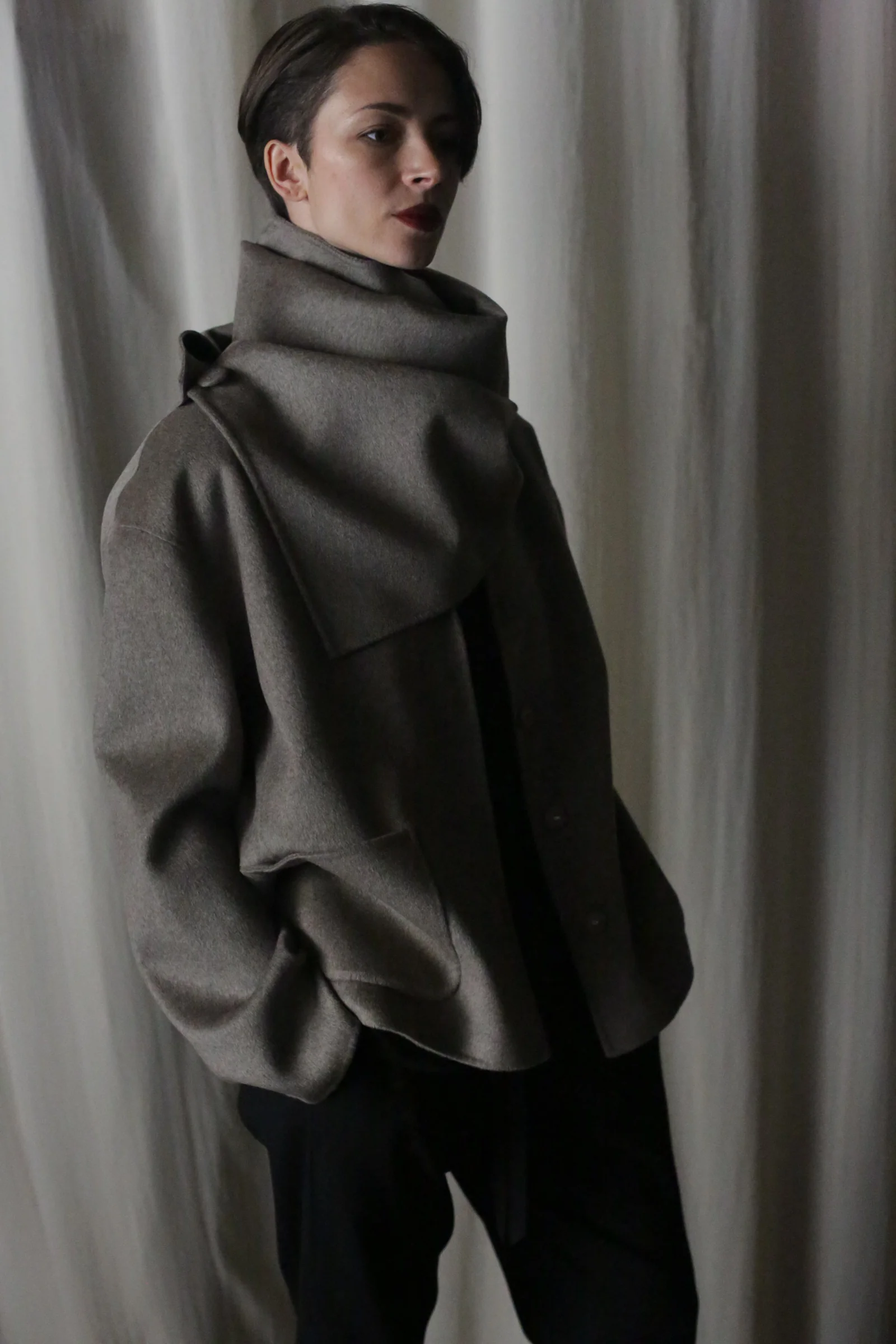 This innovative piece swaddles you in our most luxurious material - Double-faced cashmere, undyed in a luminous white or in natural . A model of simplicity, this single swath has grosgrain ribbon to wrap the fabric around you, either as a scarf or overlapping as a spontaneous vest.